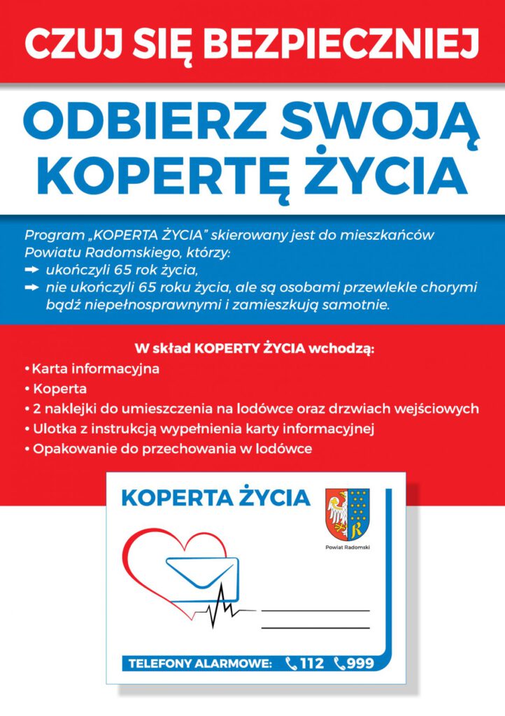 Pakiety „KOPERTA ŻYCIA” dostępne są w Starostwie Powiatowym w Radomiu w ramach realizowanego przez Powiat Radomski programu „KOPERTA ŻYCIA”.