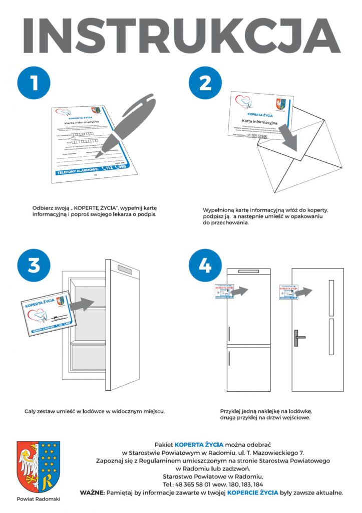Więcej informacji o programie „ KOPERTA ŻYCIA” można uzyskać w Wydziale Zdrowia i Spraw Społecznych Starostwa Powiatowego w Radomiu ul. Mazowieckiego 7 tel. 48 365 58 01 wew. 183. pok. 233 lub aplusa@spradom.eu