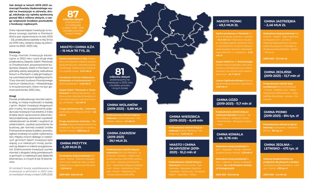 Wydatki budżetowe na rok 2022 Zarząd Powiatu zaplanował w wysokości 214 milionów 410.218,08. Wydatki majątkowe stanowią kwotę 62 miliony 276.021,49 złotych, w tym: dotacje na inwestycje 40.016.716,49 złotych, z tego dla: samorządu województwa mazowieckiego 205.792,38 złote, Hospicjum Królowej Apostołów w Radomiu 100.000 złotych i samodzielnych publicznych zespołów zakładów opieki zdrowotnej 39.710.924,11 złotych oraz wpłaty na państwowy fundusz celowy na finansowanie lub dofinansowanie 150.000 złotych dla Państwowej Straży Pożarnej na nowy ciężki samochód ratowniczo-gaśniczy dla Komendy Miejskiej PSP w Radomiu.