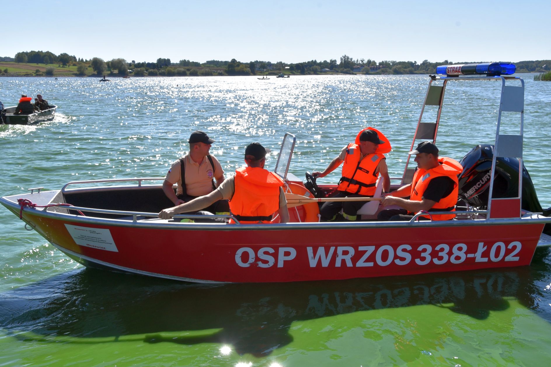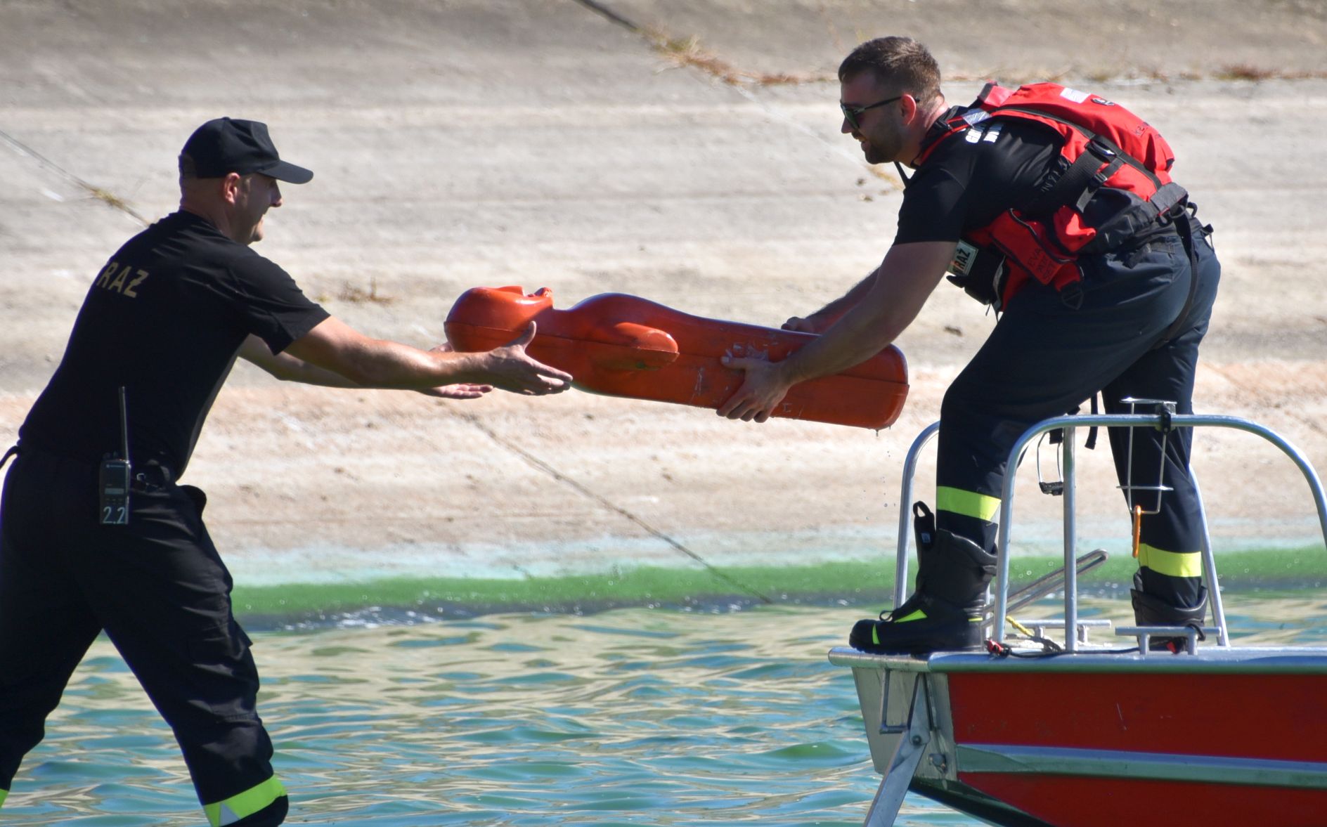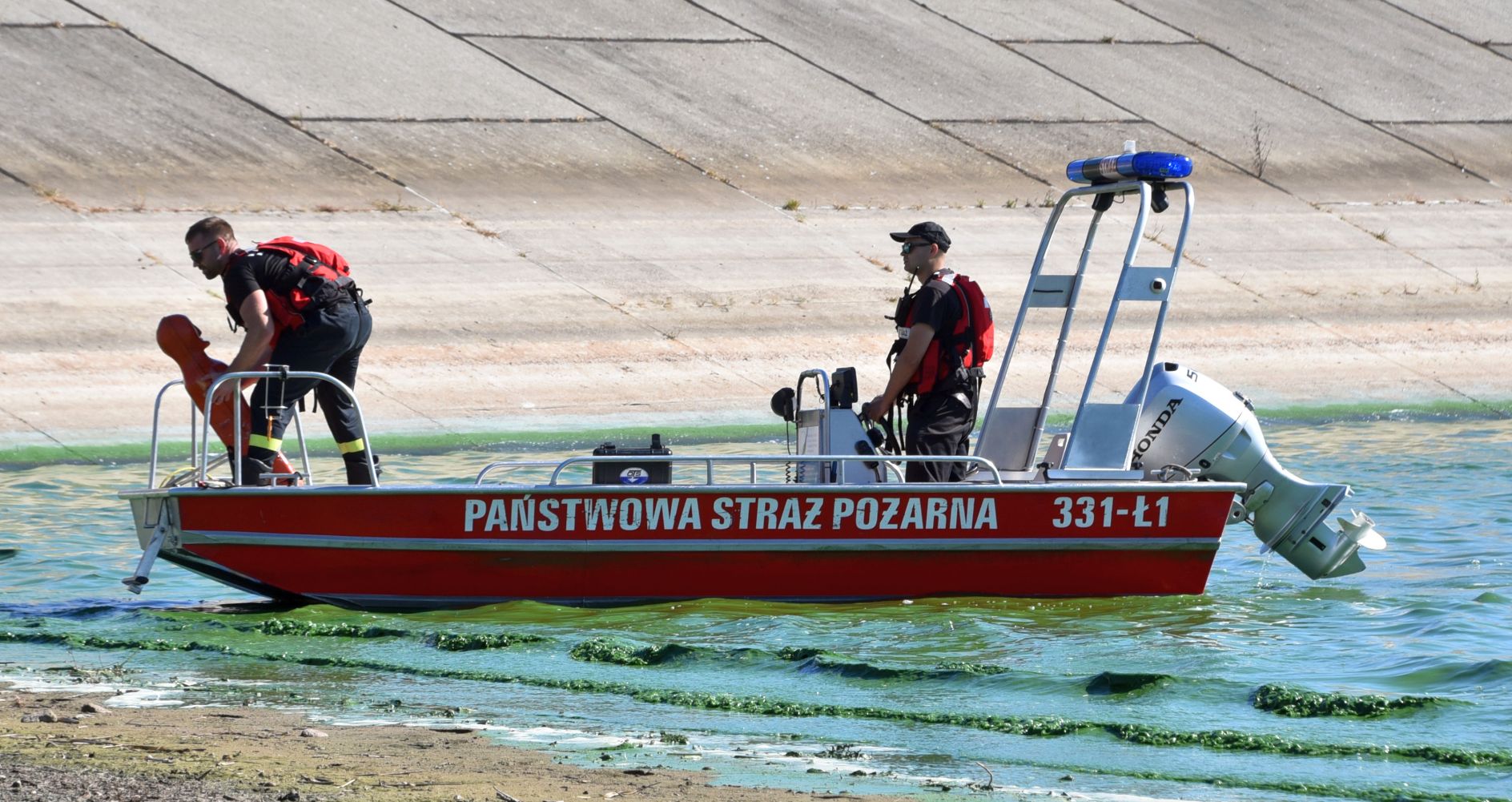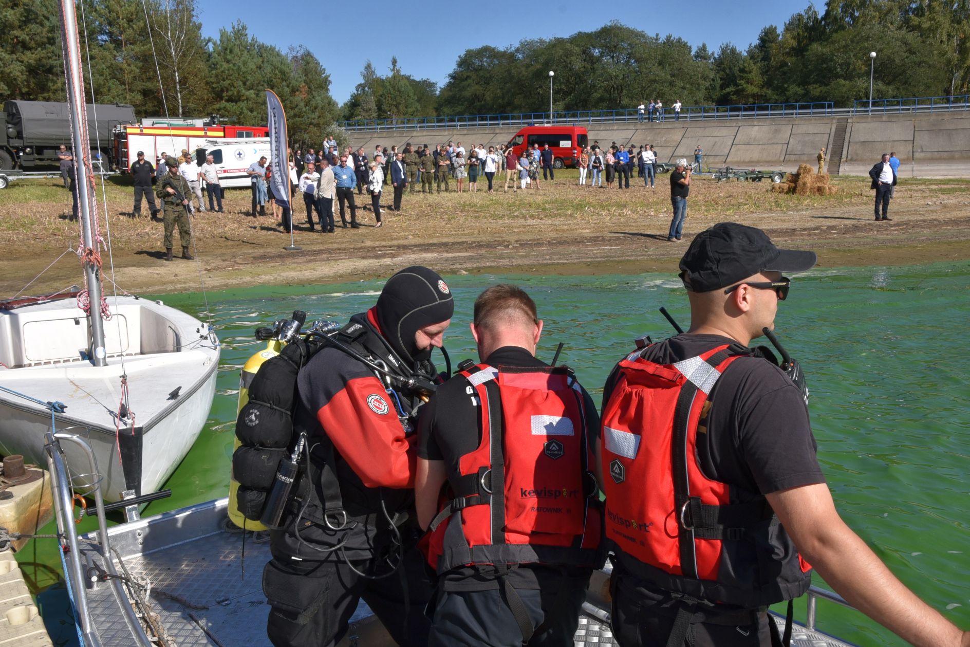 Tymczasem nurkowie zauważyli, że z beczki, przewożonej w busie wydobywa się nieznana substancja, barwiąc wodę na zielono. Ne miejsce wyruszyła kolejna Specjalistyczna Grupa Ratownictwa Chemiczno – Ekologicznego RADOM 6. Ich ciężki wóz ratowniczy nie miał możliwości dojazdu bezpośrednio do brzegu, dlatego strażacy przetransportowali na miejsce potrzebne wyposażenie za pomocą modułowego wózka. Przygotowali specjalny wąż, do którego wtłaczali powietrze, układając go na powierzchni wody tak, aby ograniczyć rozprzestrzenianie się substancji. Następnie, po wyłowieniu i zabezpieczeniu beczki, przekazali ją do dalszego badania.