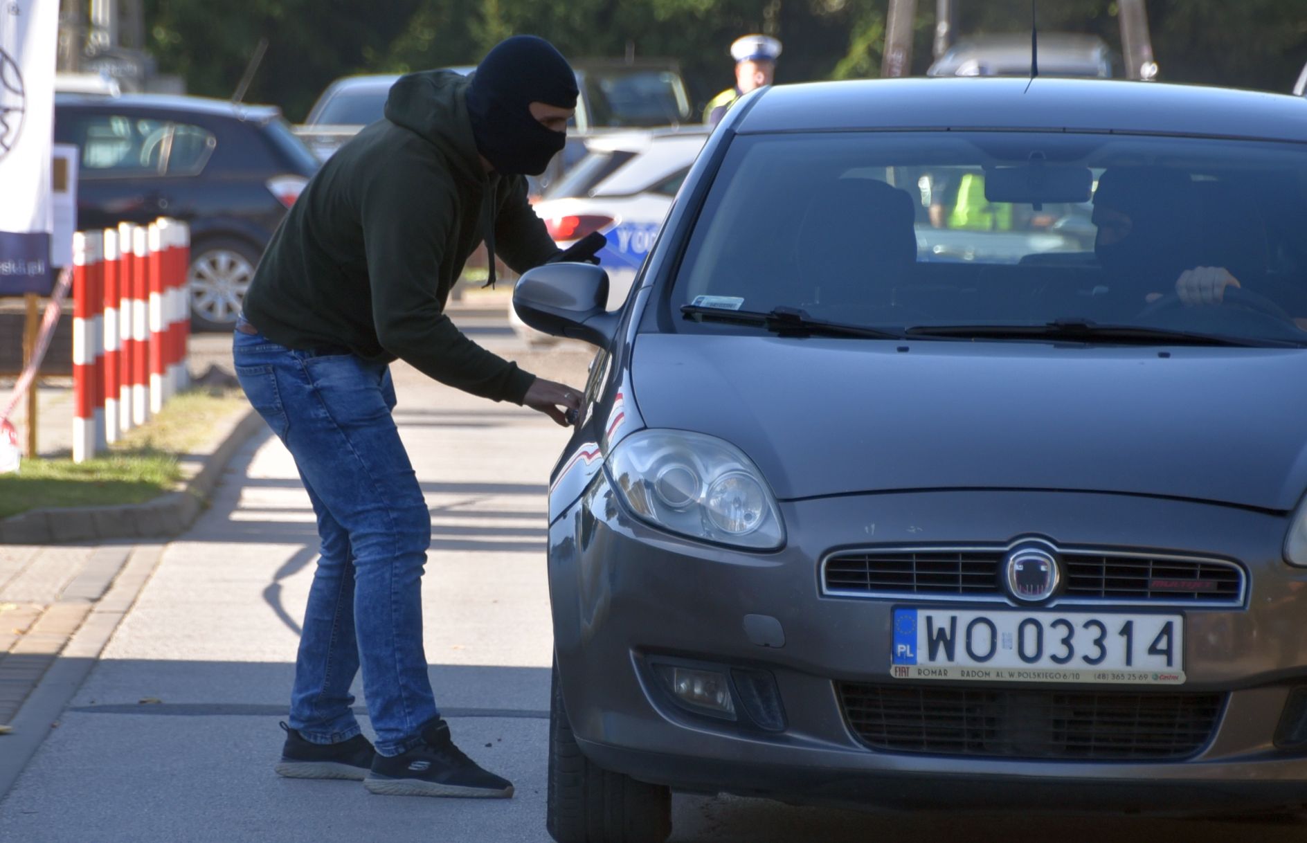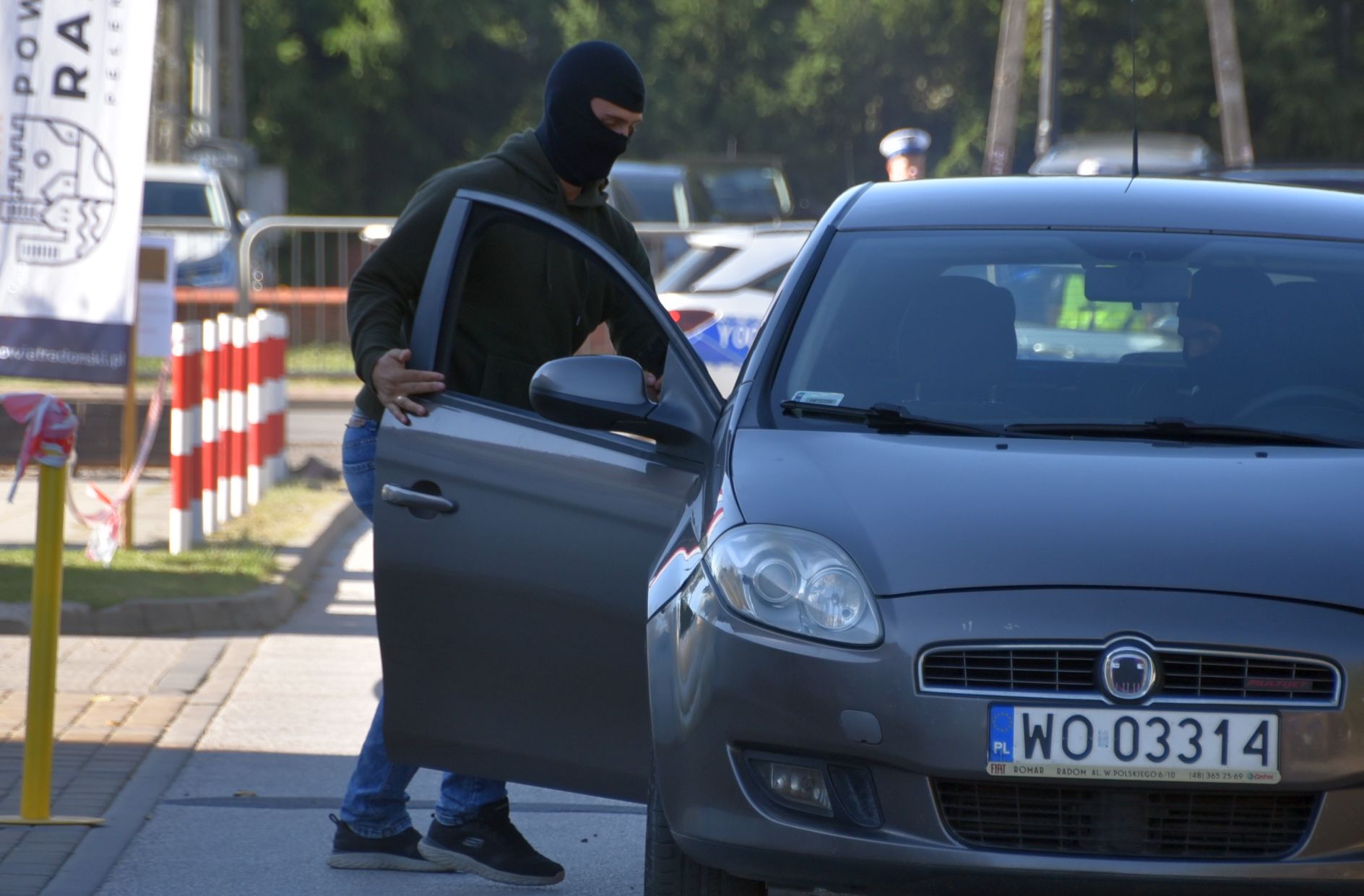 Jak się okazało, uzbrojony sprawca uciekł do czekającego przed urzędem samochodu, a następnie rozpoczął ucieczkę w kierunku gminy Przytyk. Rozpoczął się pościg, prowadzony przez Nieetatową Grupę Realizacyjną KMP w Radomiu. Tymczasem patrol radomskiej drogówki, pełniący służbę przy drodze wojewódzkiej numer 740 w miejscowości Wrzeszczów zauważył, jak kierujący pojazdem osobowym na widok radiowozu zawrócił i zjechał w drogę leśną. Patrol ruszył więc w pościg za tym samochodem z użyciem sygnałów dźwiękowych i świetlnych, powiadamiając jednocześnie oficera dyżurnego KMP Radom.