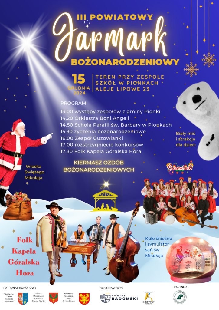 Już po raz trzeci Powiat Radomski, Powiatowy Instytut Kultury wraz z partnerami – Miastem Pionki oraz Gminą Pionki, organizuje Powiatowy Jarmark Bożonarodzeniowy – tym razem w Pionkach. Zapraszamy mieszkańców w niedzielę, 15 grudnia na teren Zespołu Szkół przy Alejach Lipowych 23. Będzie można złożyć sobie życzenia, podzielić się opłatkiem, czy kupić ozdoby bożonarodzeniowe podczas kiermaszu w hali sportowej. Zagrają lokalne zespoły dziecięce i ludowe, a także Orkiestra Boni Angeli z gminy Pionki, Schola Parafii św. Barbary w Pionkach, a także Zespół Guzowianki i Folk Kapela Góralska Hora!