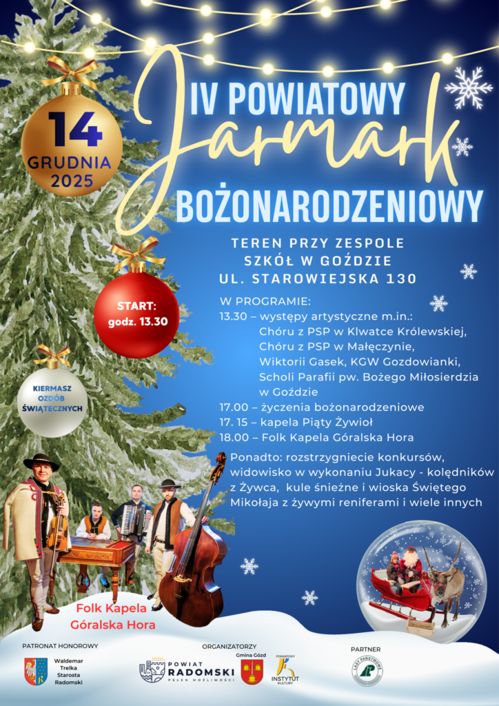 IV Powiatowy Jarmark Bożonarodzeniowy odbędzie się w niedzielę, 14 grudnia 2025 roku na terenie Zespołu Szkół w Goździe. Będzie kiermasz rękodzieła, występy lokalnych zespołów i wokalistów, a wśród atrakcji grupa kolędnicza „Dziady Spod Matyski” z Radziechwa na Żywiecczyźnie, koncert folk kapeli Góralska Hora oraz… żywe renifery!