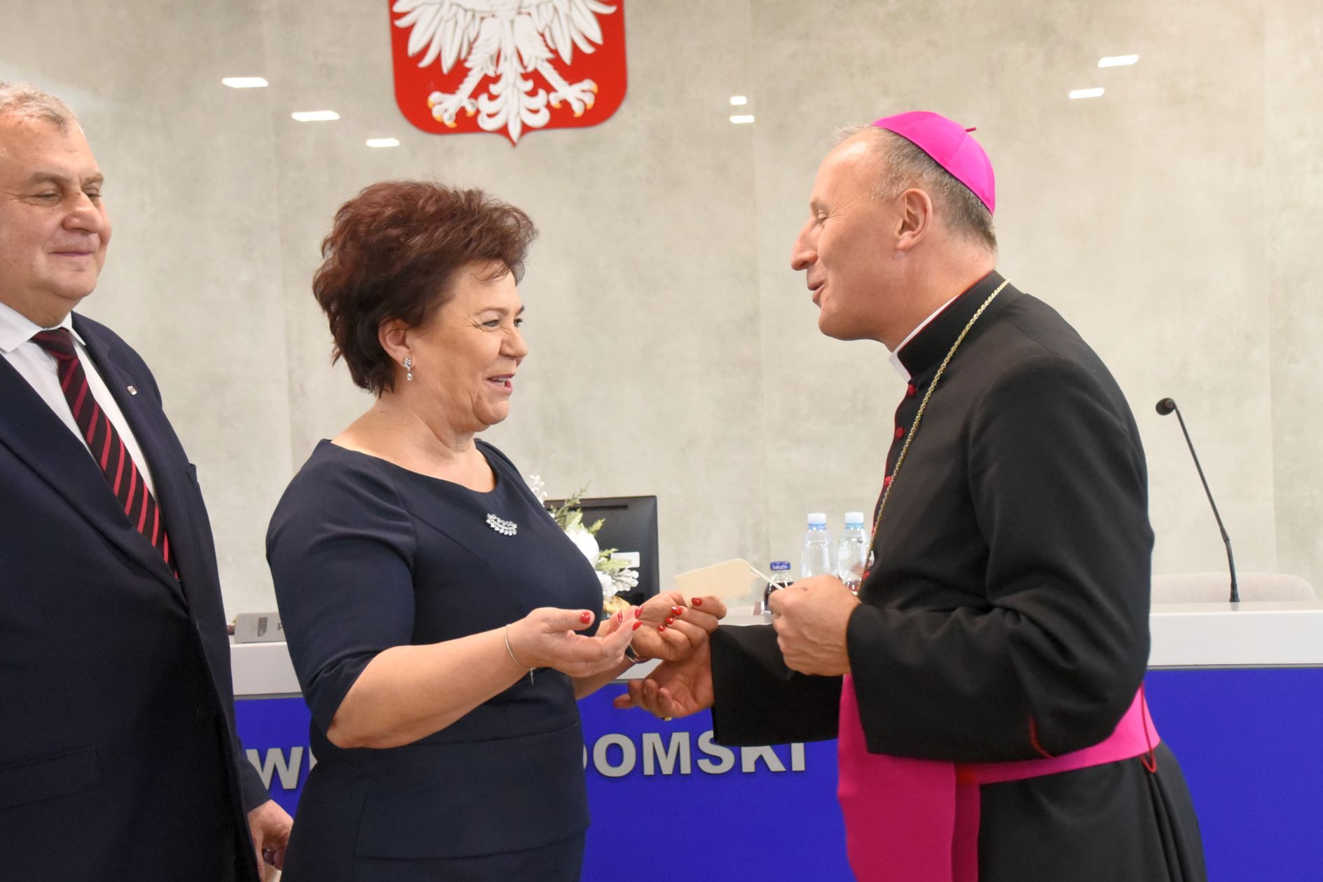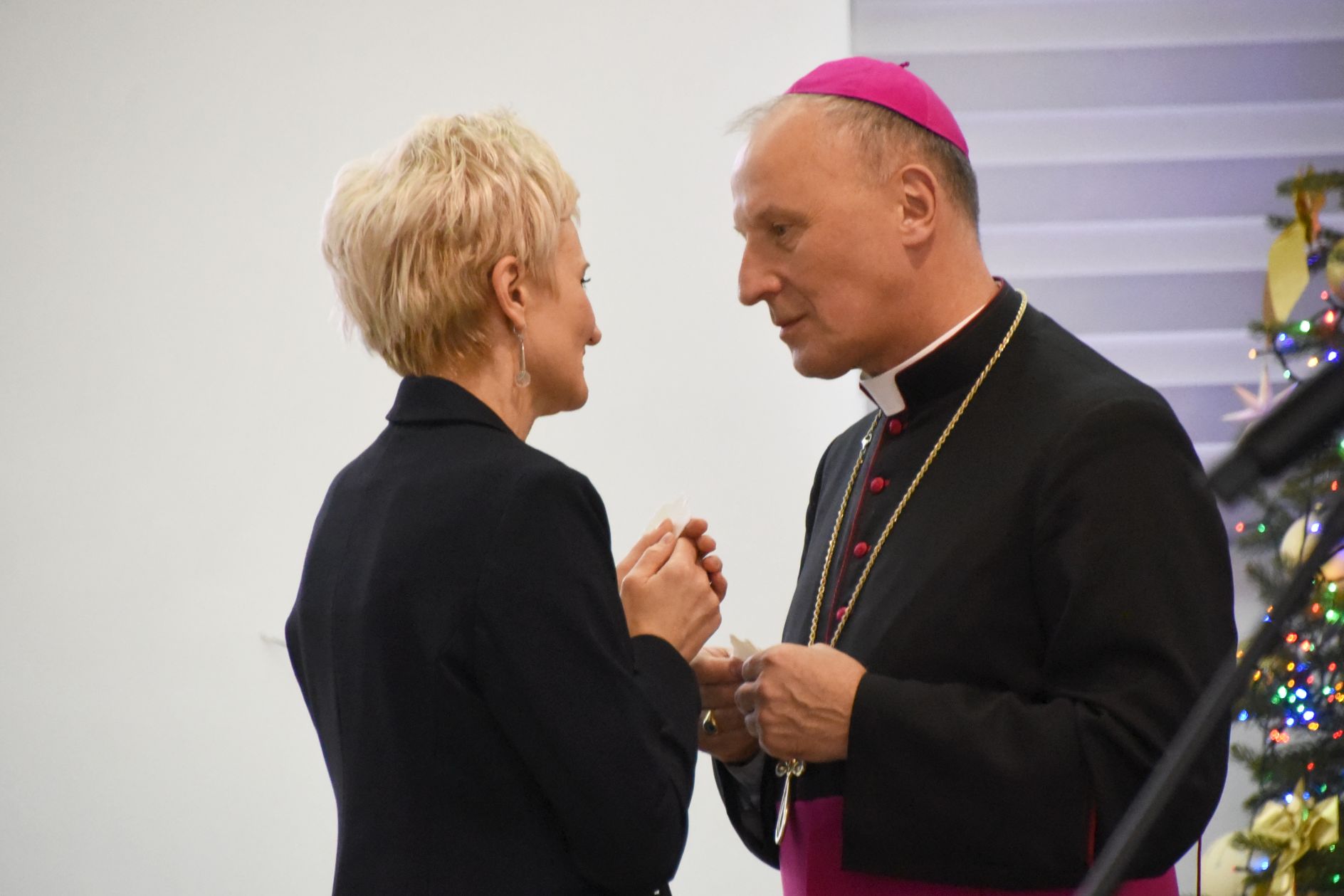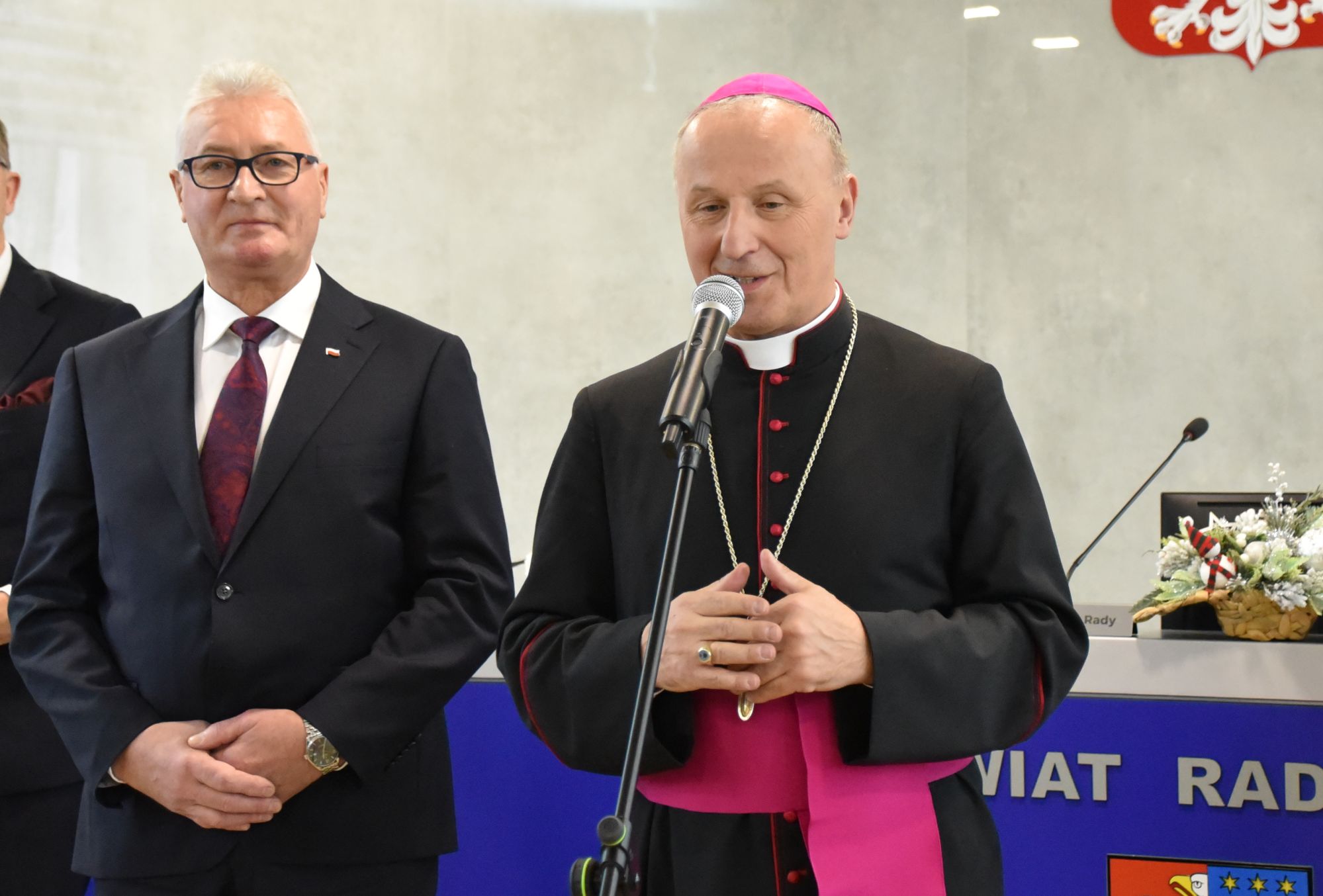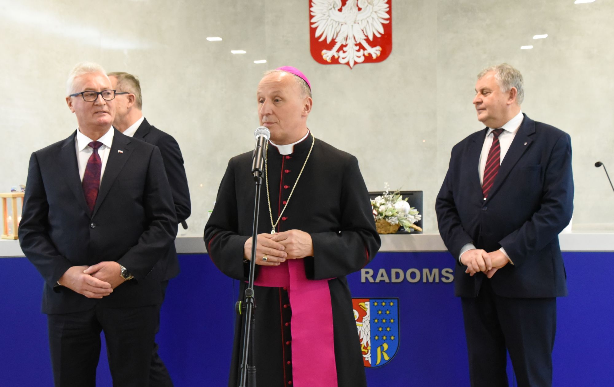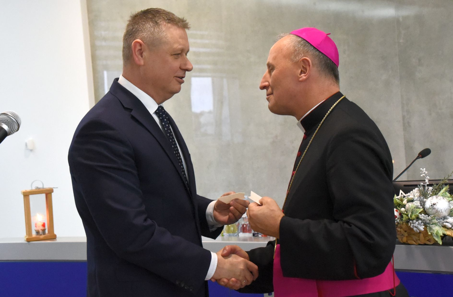 – Życzę miłości, jedności w waszych rodzinach i w tym wszystkim co czynicie działając dla dobra Powiatu Radomskiego – mówił ksiądz biskup Marek Solarczyk, składając każdemu z osobna życzenia.