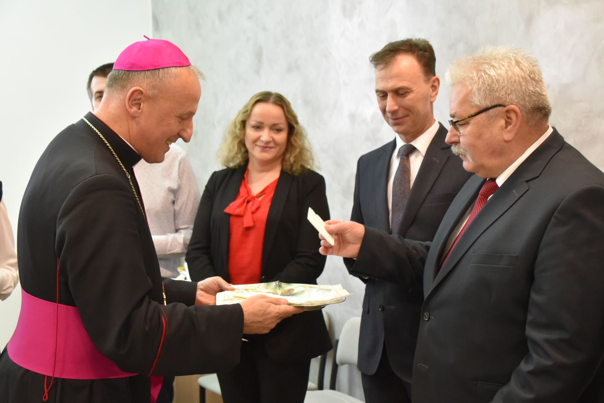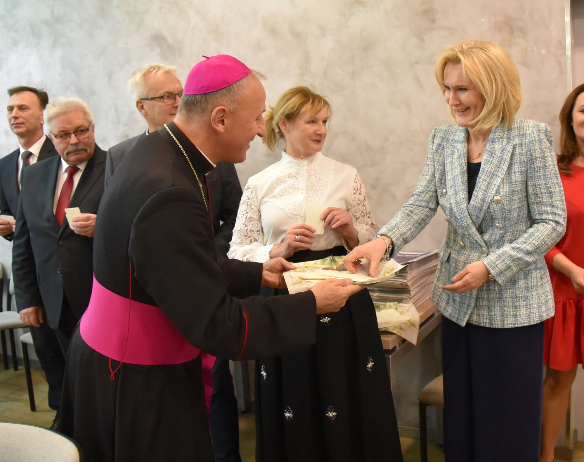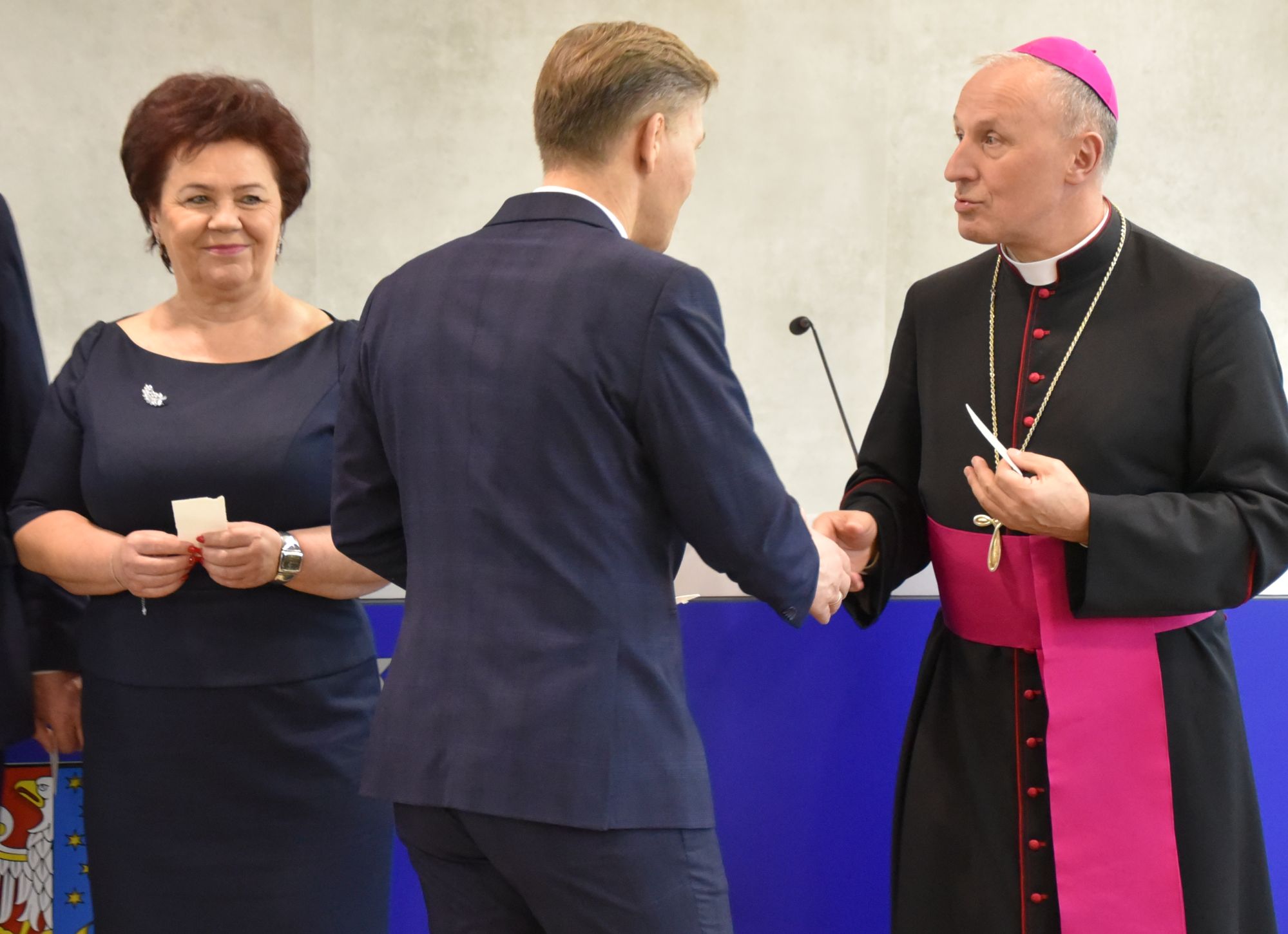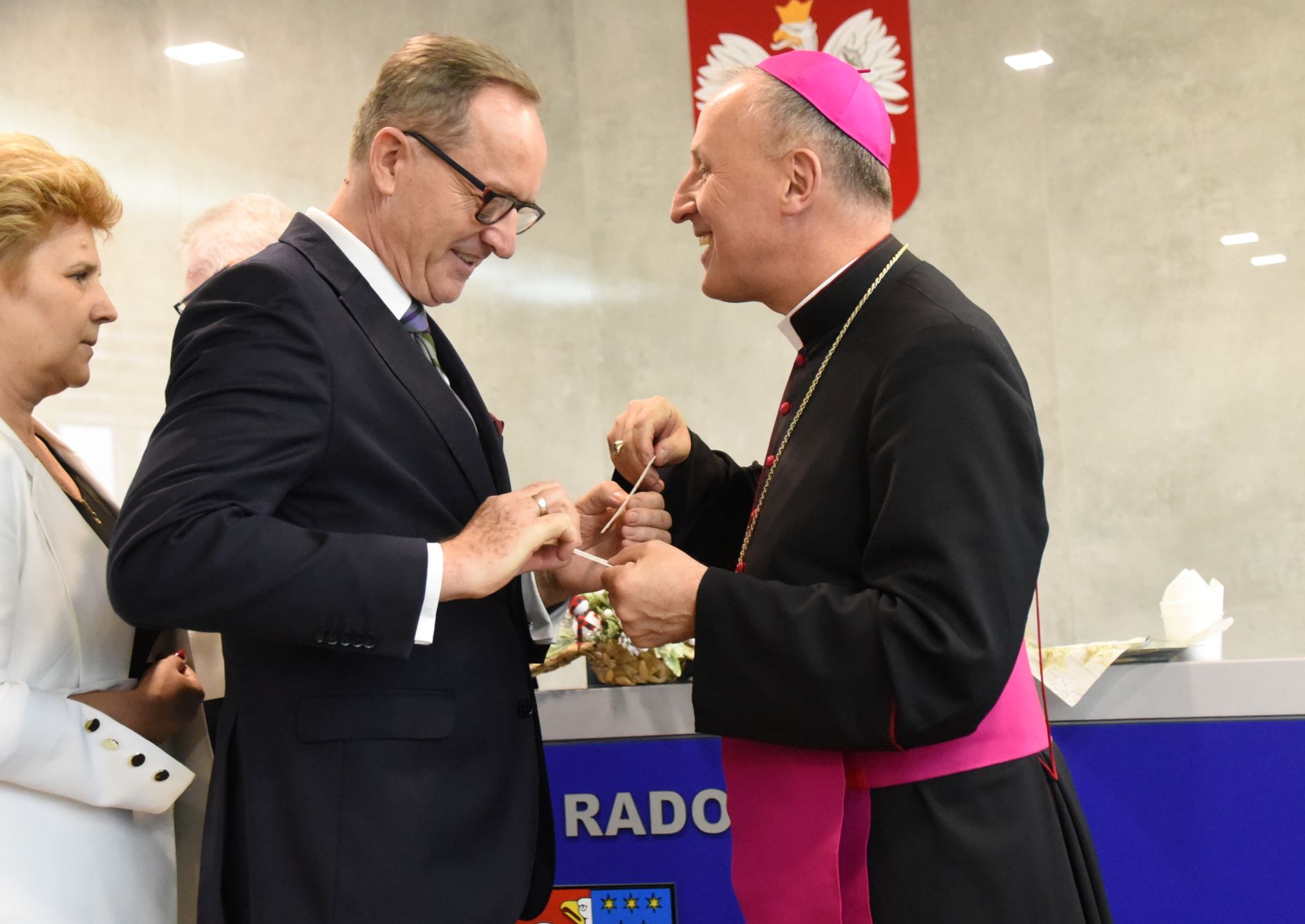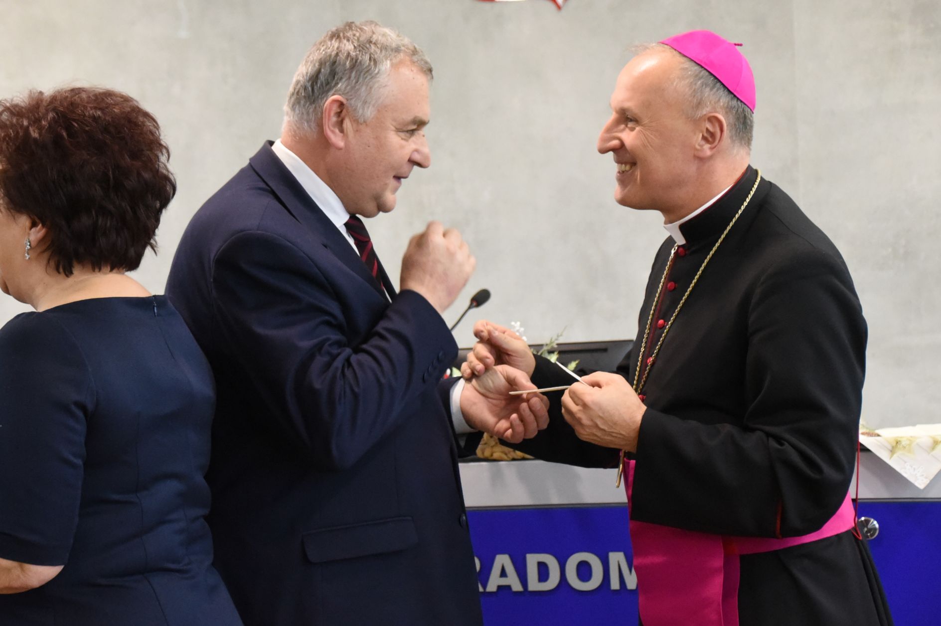 – Życzę miłości, jedności w waszych rodzinach i w tym wszystkim co czynicie działając dla dobra Powiatu Radomskiego – mówił ksiądz biskup Marek Solarczyk, składając każdemu z osobna życzenia.