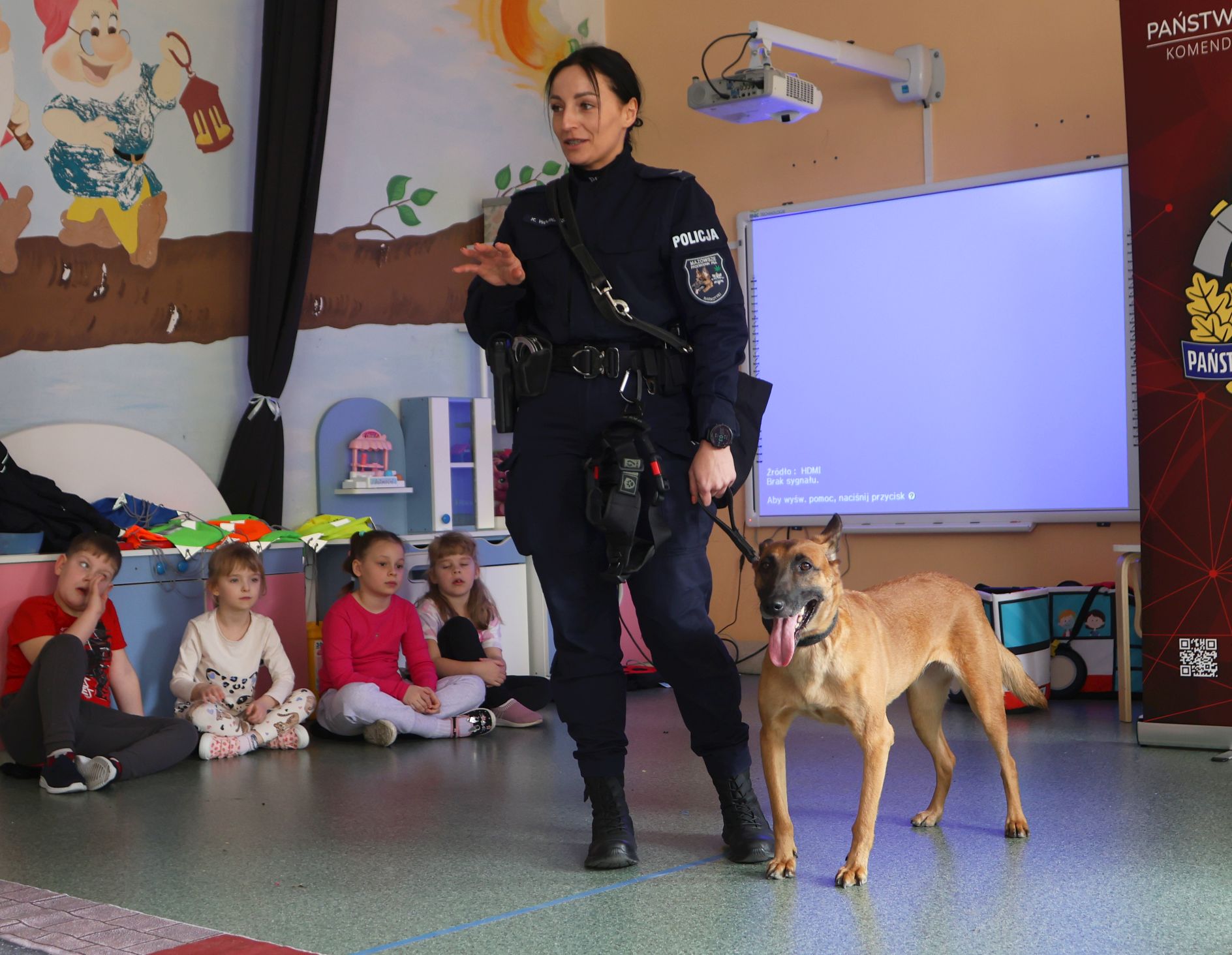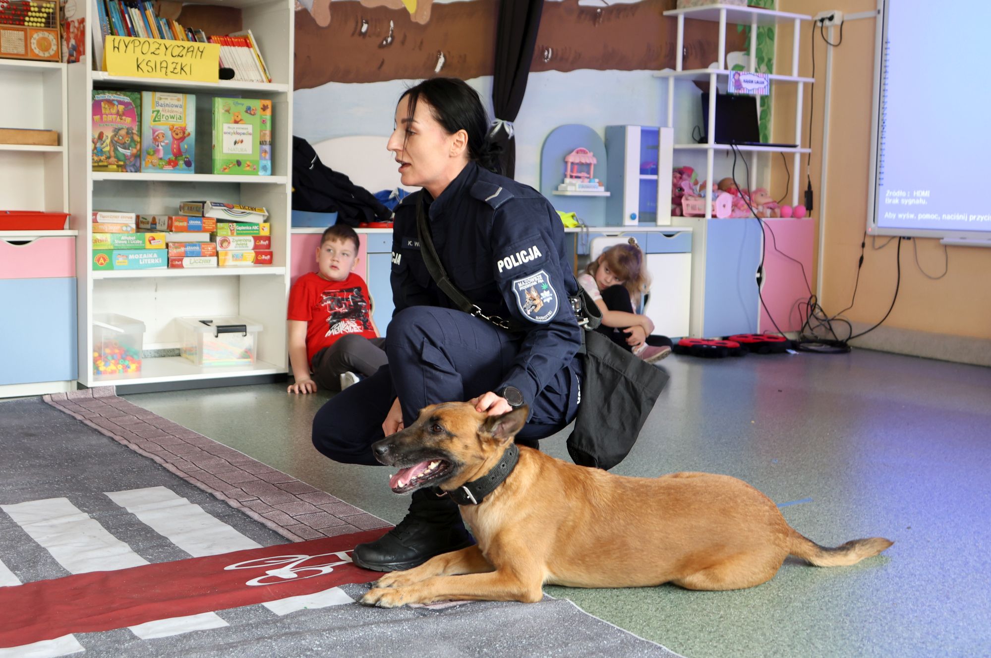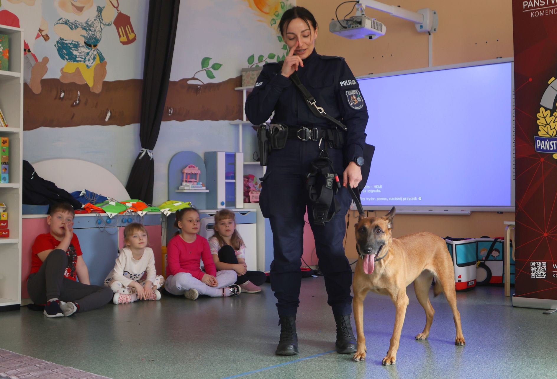 Przedszkolaków odwiedził również pies Mona, owczarek belgijski, który pracuje w policji i wykorzystywany jest do poszukiwania narkotyków.