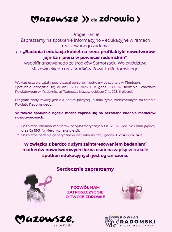 Samodzielny Publiczny Zespół Zakładów Opieki Zdrowotnej w Pionkach realizuje program pn. „Badania i edukacja kobiet na rzecz profilaktyki nowotworów jajnika…