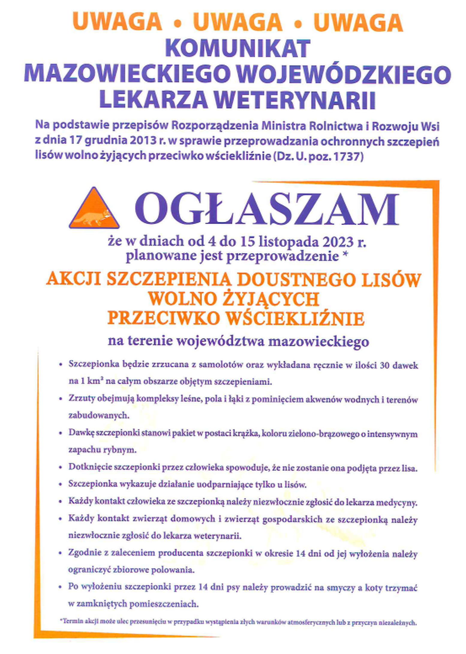 Poniżej przedstawiamy Rozporządzenie Wojewody Mazowieckiego w sprawie zwalczania wścieklizny zwierząt.