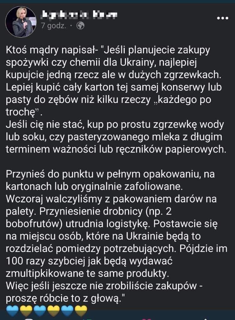WAŻNE! Obecnie nie ma potrzeby samodzielnego zawożenia darów bezpośrednio na granicę. Jest tam mnóstwo rzeczy przywiezionych z całej Polski, a możliwości przekazywania tego ludziom po stronie ukraińskiej są dość ograniczone lub prawie niemożliwe albo zajmują wiele czasu.